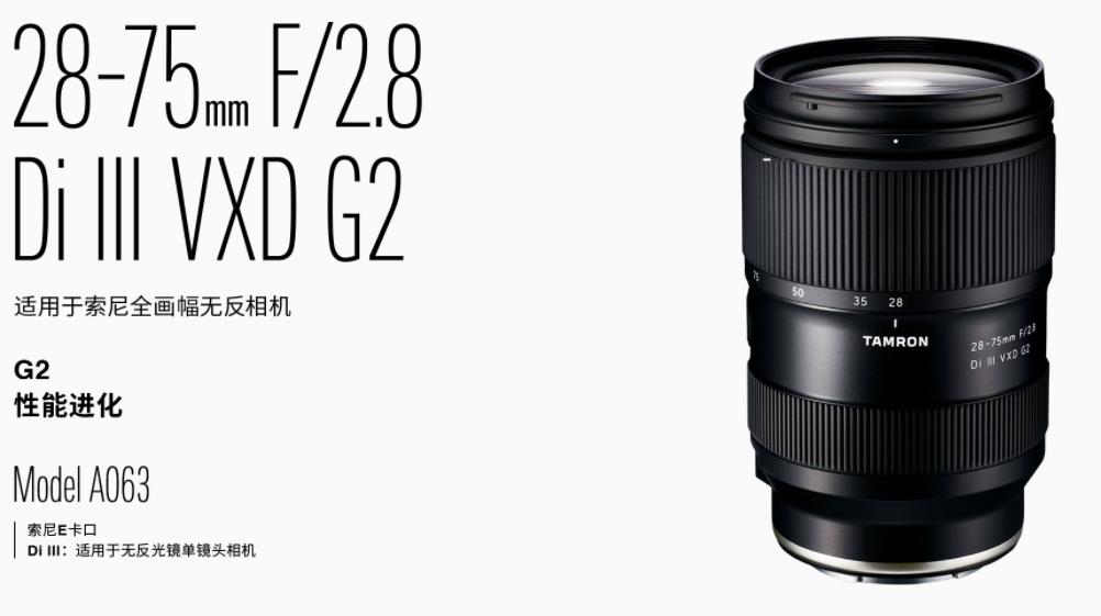 28-75mm F/2.8 Di III VXD G2(型号 A063)是一支拥有出色解析力和轻巧紧凑外形、适用于全画幅无反相机的索尼E卡口大光圈标准变焦镜头。作为获得市场高度评价的28-75mm F/2.8 Di III RXD(型号 A036)的后续型号,一大进化便是其高精细的清晰画质。我们在保持A036紧凑外观尺寸的基础上,重新对A063的光学系统进行了设计。镜头全焦段从画面中心到周边拥有锐利的表现性能,同时还能体验大光圈的柔美虚化效果。AF驱动中搭载了具有高速、高精度自动对焦性能的线性马达对焦机构VXD(音圈高转矩驱动)。A063的近摄能力也有所提升,广角端28mm处的最近拍摄距离为0.18m,最大摄影倍率为1:2.7。通过镜头新功能,用户自己就能方便地进行固件更新及镜头自定义设置,比如您可根据自身喜好,变更手动对焦时对焦环的旋转方向。充满高级感的设计中带来新的外观涂装,有效提升耐磨性。滤镜口径则与腾龙的大光圈无反变焦镜头系列同为φ67mm,可共用镜头盖等配件。除配备了简易防滴构造与抗污涂层等功能外,还能对应索尼E卡口相机的各种内置功能。A063将成为腾龙第二代常备镜头,为您进一步增添摄影乐趣。