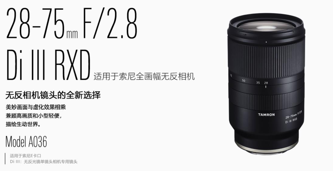 适用于全画幅无反相机,F/2.8大光圈标准变焦镜头小小的镜头中积聚了腾龙的尖端技术,特别针对无反相机进行了全新设计。28-75mm F/2.8 Di III RXD(型号A036)兼具高解析力与柔和虚化效果,是用于索尼E卡口的35mm全画幅单镜头无反相机大光圈标准变焦镜头。镜头使用了多种特殊玻璃材质,有效抑制各种像差,全焦段均具有稳定的解析性能,并且高画质与小型轻便兼具。腾龙特有的BBAR宽频抗反